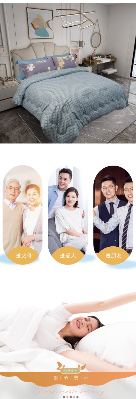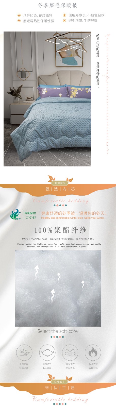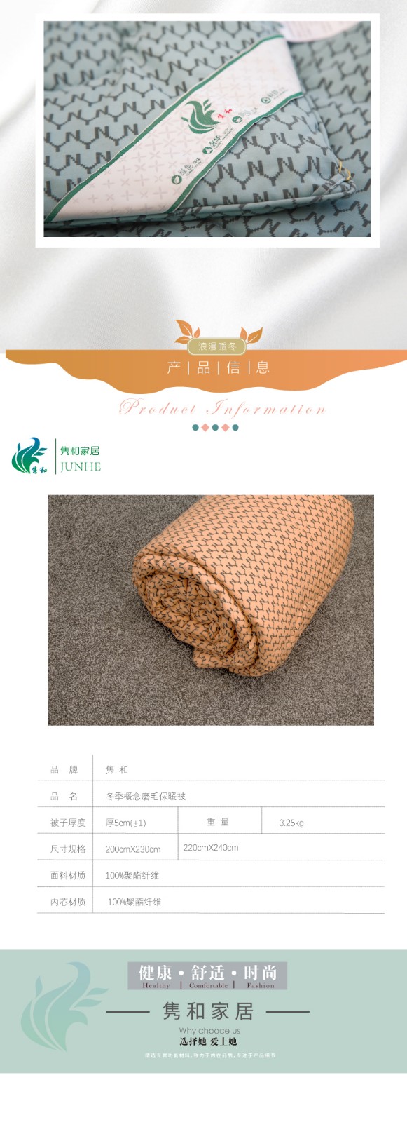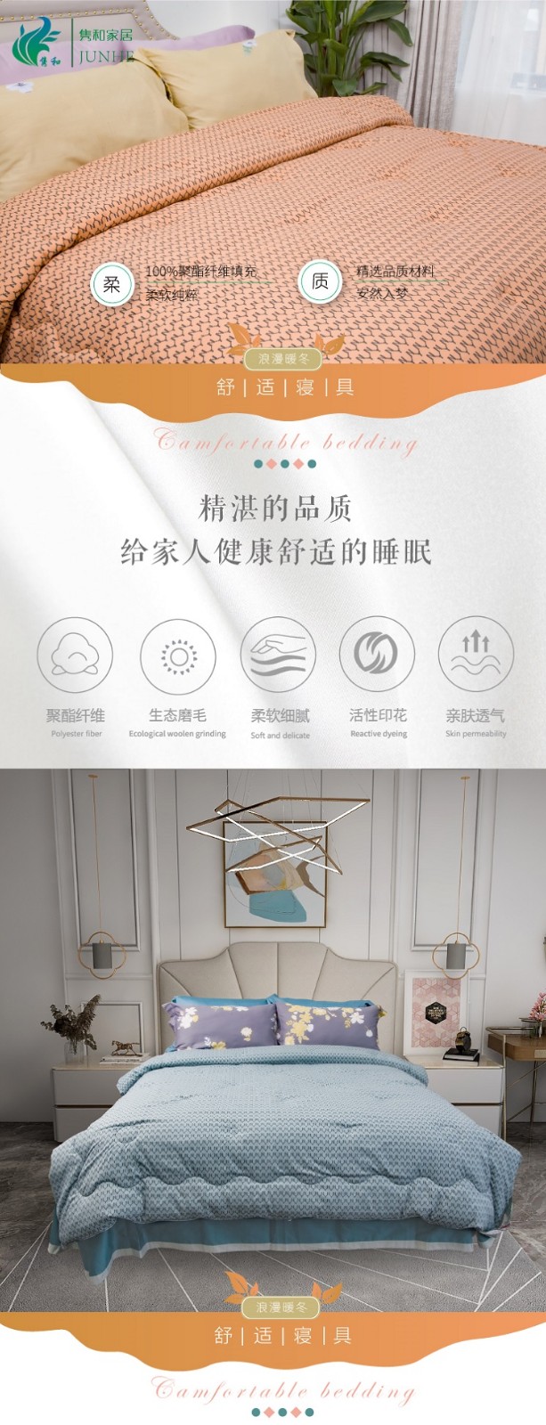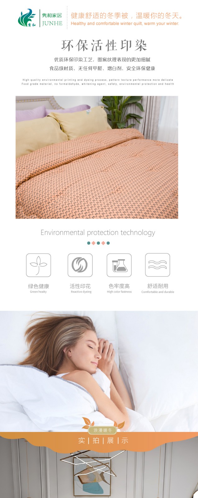 描述:100%聚酯纖維棉,大方設(shè)計(jì),時(shí)尚兩色任選 優(yōu)質(zhì)環(huán)保印染工藝,無任何甲醉,增白劑,更健康,跟保暖,更實(shí)惠
