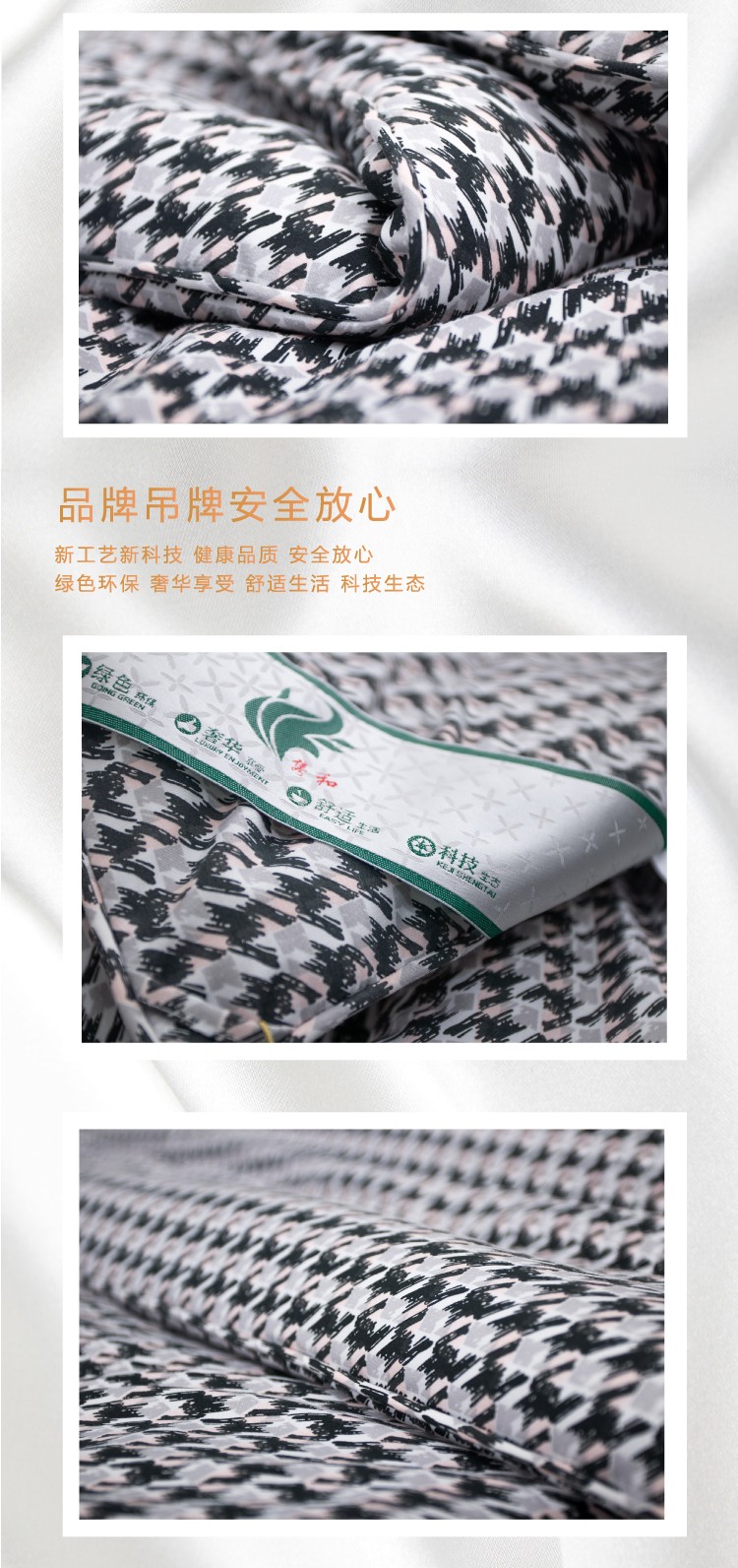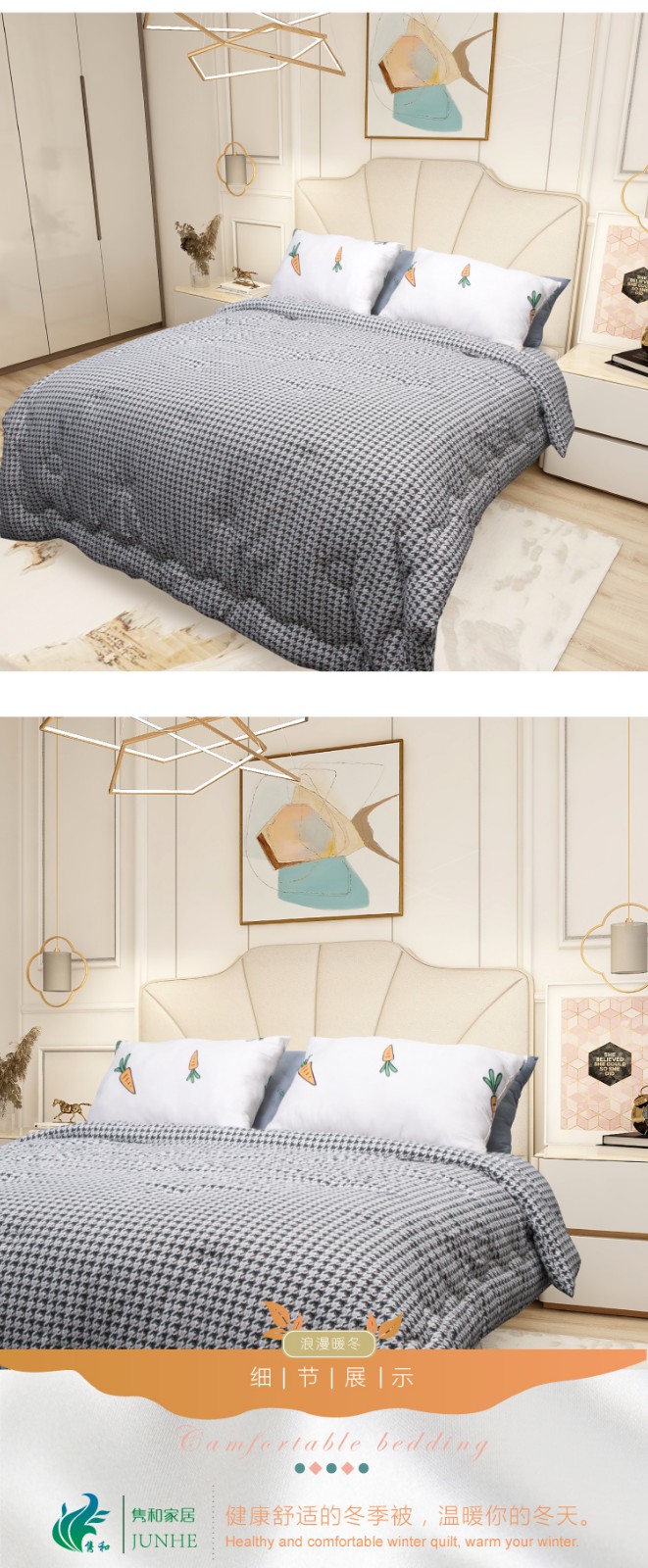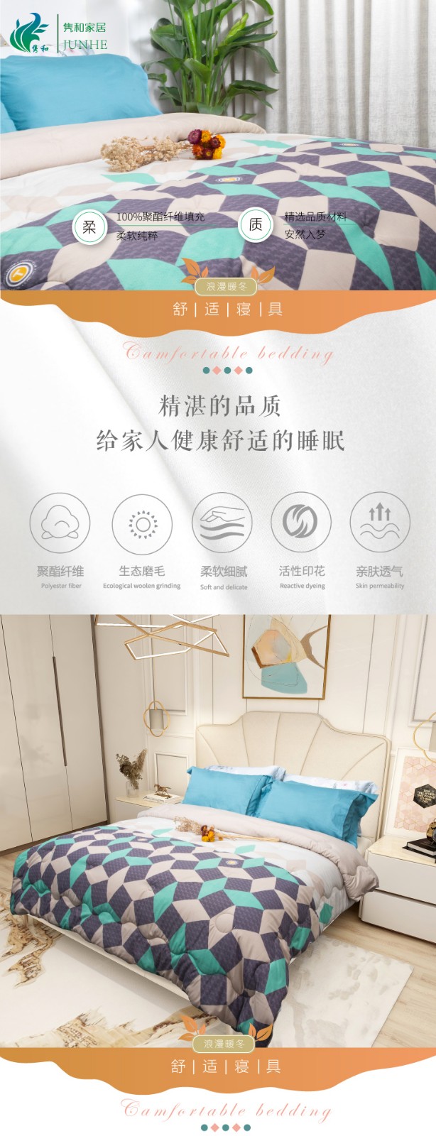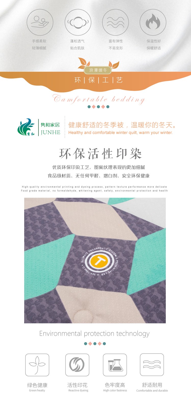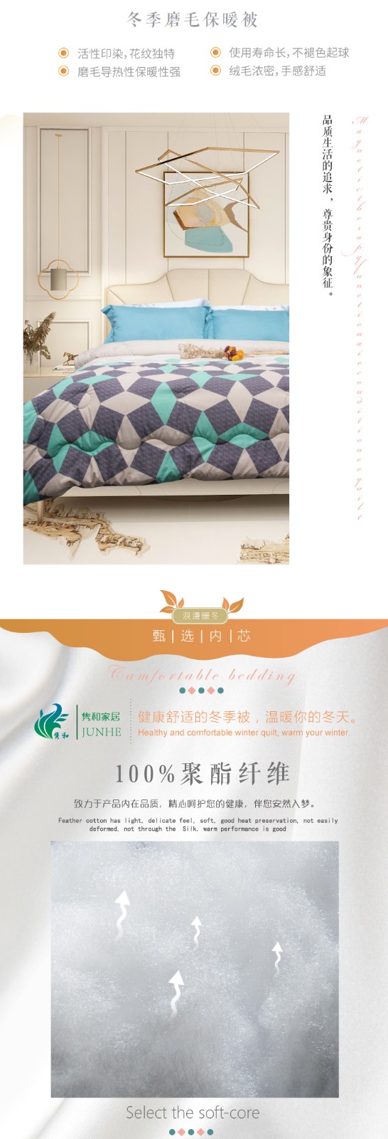 描述:100%聚酯纖維棉,大方設(shè)計,面料柔軟細膩、親膚透氣 優(yōu)質(zhì)環(huán)保印染工藝,無任何甲醉,增白劑,更健康,跟保暖,更實惠