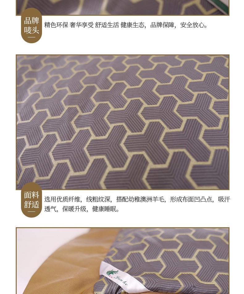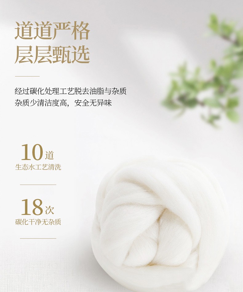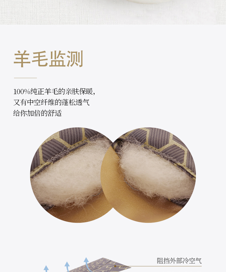 描述:挑選高品質(zhì)羊毛填充,卷曲特性能夠存儲(chǔ)大量空氣,提溫不易流散更保暖 層層甄選,經(jīng)過(guò)碳化處理工藝脫去油脂與雜質(zhì),雜質(zhì)少清潔度高,安全無(wú)異味