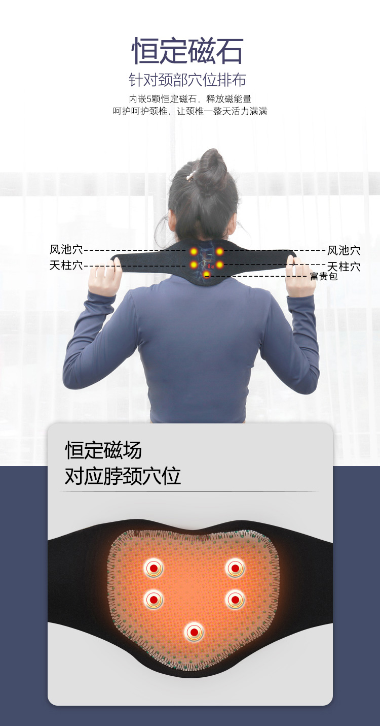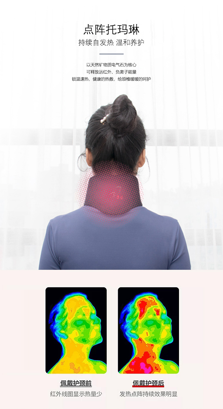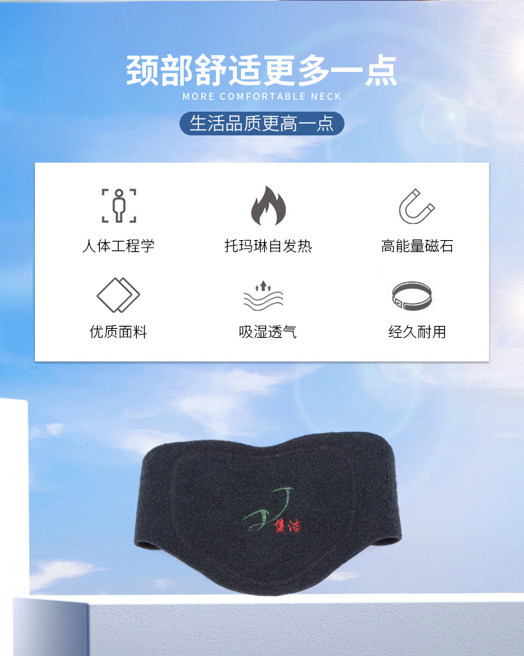 描述:內(nèi)嵌5顆恒定磁石,以天然礦物質(zhì)電氣石為核心,可釋放遠(yuǎn)紅外、負(fù)離子能量,鎖溫速熱,健康的熱敷,給頸椎暖暖的呵護(hù)