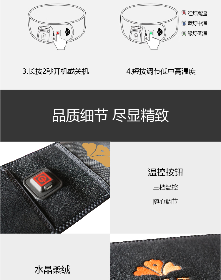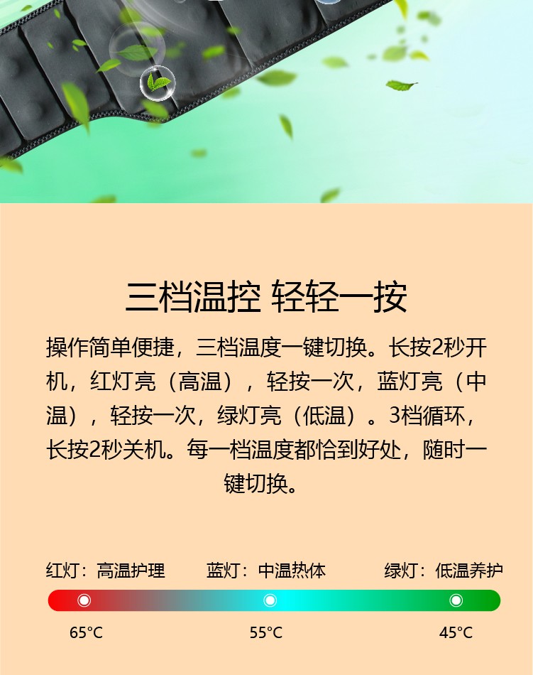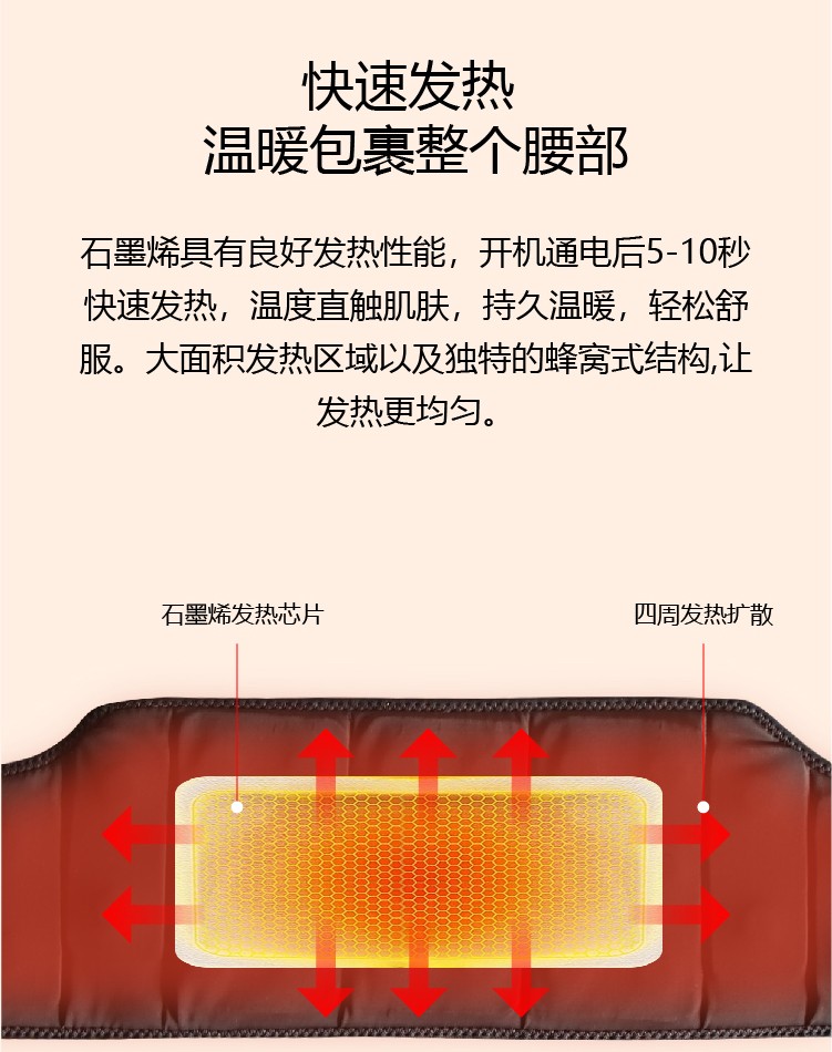 功能:石墨烯熱敷、強磁灸穴、暖腹護腰、負(fù)離子