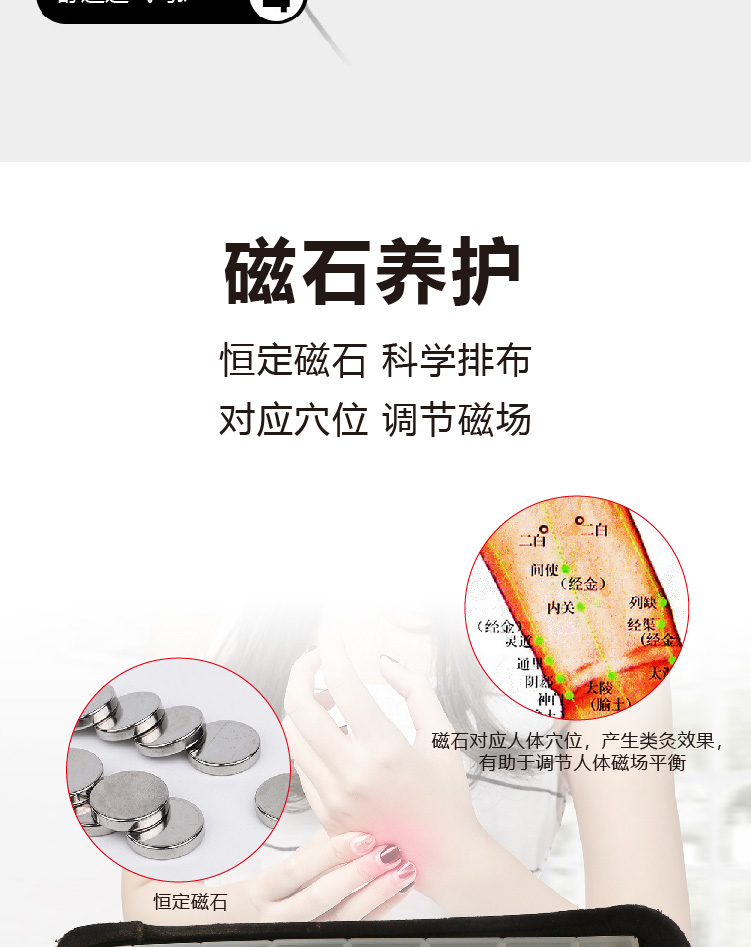 描述:內(nèi)嵌生物磁石,磁場作用于局部穴位,產(chǎn)生類針灸效果,還可用于緩解手腕部關(guān)節(jié)炎,腫脹,麻木等不適。