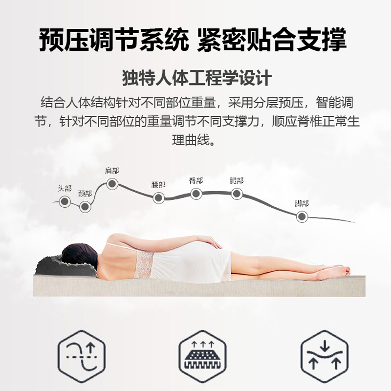 描述:14層功能結(jié)構(gòu)層,蘊含托瑪琳、負(fù)離子、遠紅外、磁石養(yǎng)生、按摩等功能 采用人體生理曲線設(shè)計,能調(diào)節(jié)不同部位體重的支撐力,零壓力更舒適 打造出科學(xué)的健康睡眠系統(tǒng),在睡眠中起到養(yǎng)生的作用