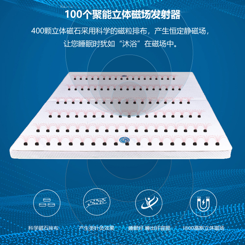描述:床墊采用托瑪琳功能層、恒定能量磁場(chǎng)層、進(jìn)口環(huán)保架橋按摩層、抗菌防螨功能層等13層復(fù)合材料結(jié)構(gòu)、400顆磁石、100個(gè)磁架形成聚能立體磁場(chǎng)組,產(chǎn)生恒定磁場(chǎng)、符合彈性按摩墊、突球型設(shè)計(jì)人躺在上面能持續(xù)享受類指壓按摩效果,竹炭纖維吸附身體產(chǎn)生的異味輔助負(fù)氧離子讓臥室跟清新,讓你盡情享受好睡眠。